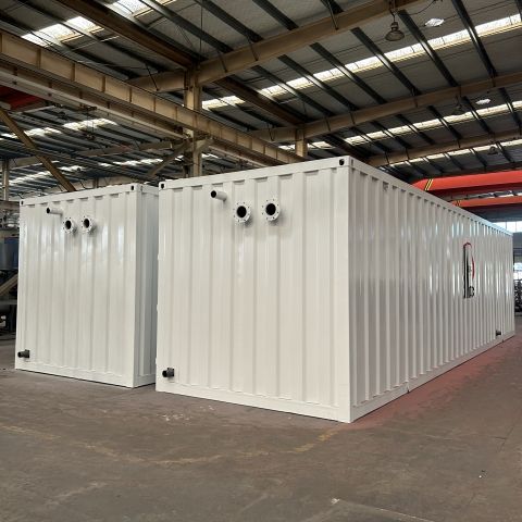 这是两台集成式的全自动智能一体化,外体为瓦楞板材质,结实并且美观,发往南方,放于地上,后期维护更加方便,每小时的处理量是25吨,设备应用于该地区的农污治理,出水符合农村污水排放标准的地方标准,进水前段